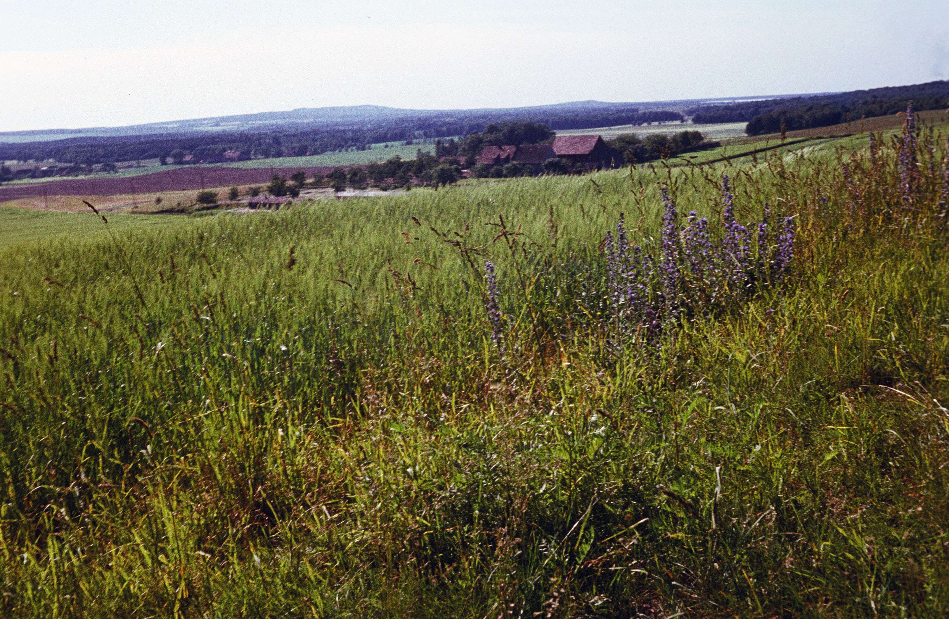 Blick vom Heideberg über hügelige Ackerlandschaft und Wald