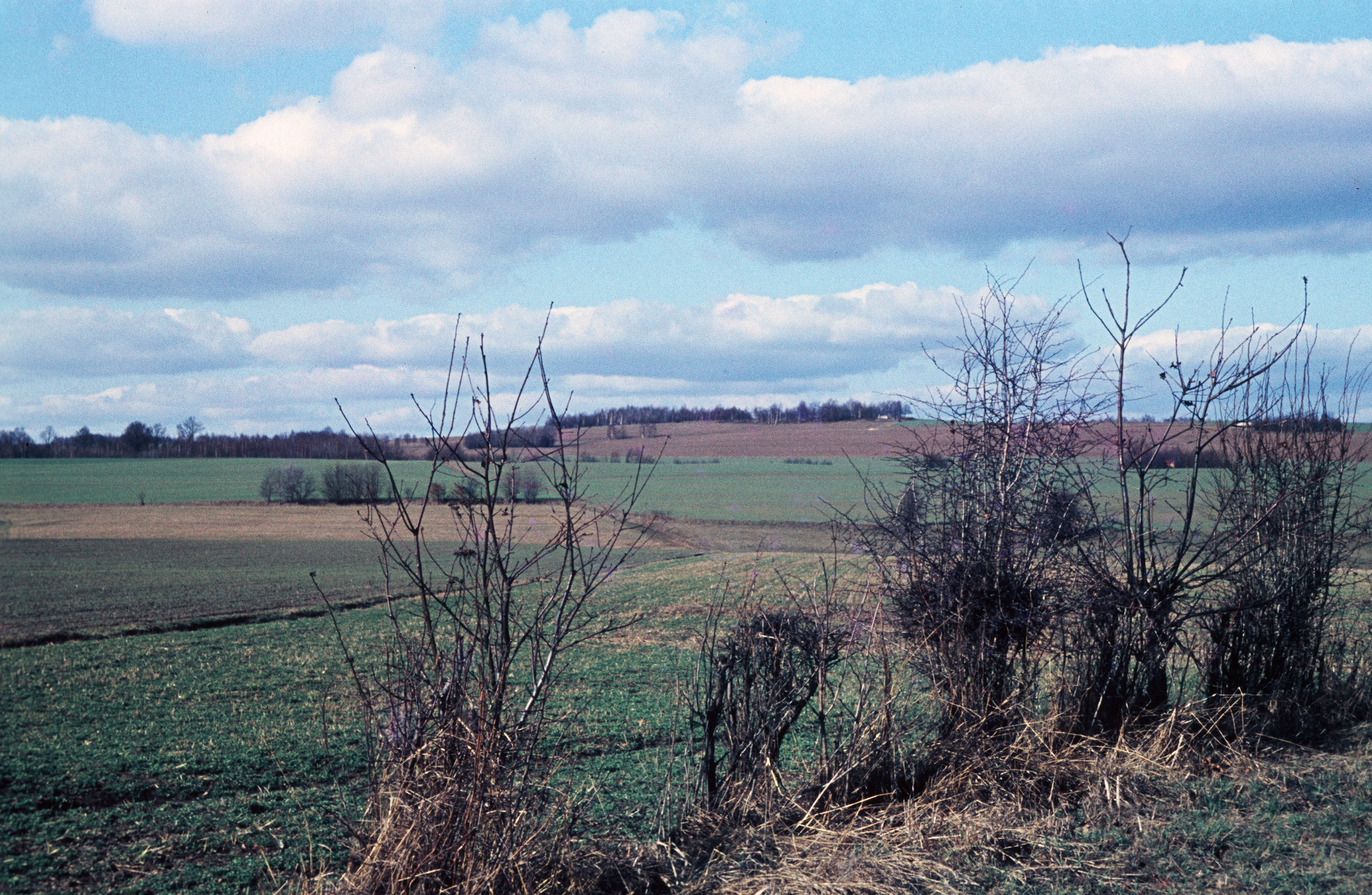 Blick vom ehemaligen Bahnübergang Klingewalde über Ackerlandschaft zum Galgenberg