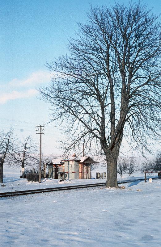 Winterlandschaft mit beschranktem Bahnübergang und Bahnübergangshäuschen (Blockstelle 161) am Schafberg