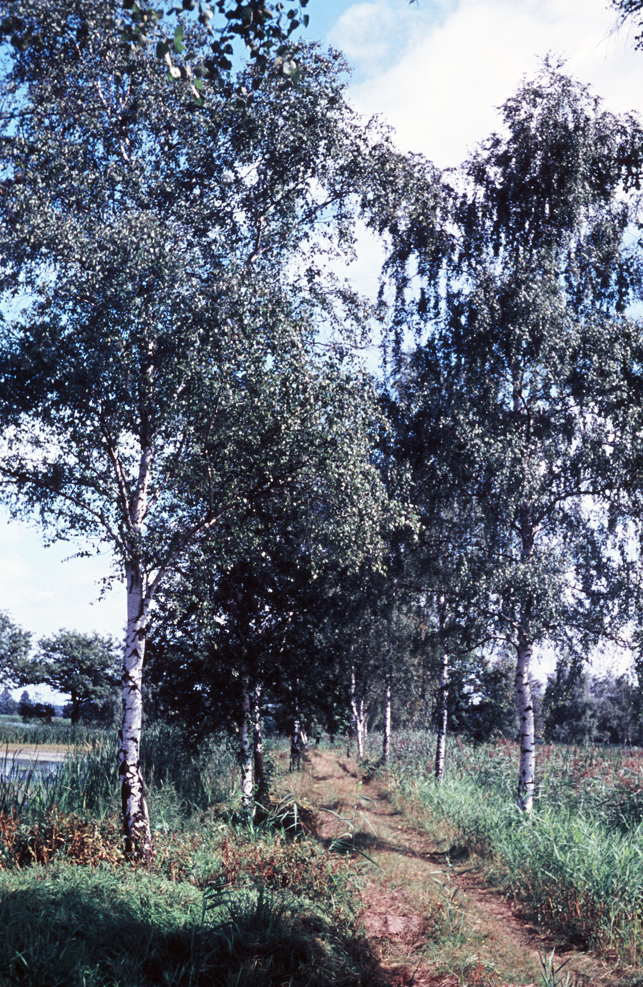 mit Birken und Schilf bewachsener Dammweg beim Krebaer Teich