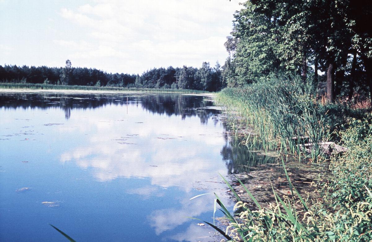 Krebaer Teich, mit Schilf bewachsenes Ufer, Wald
