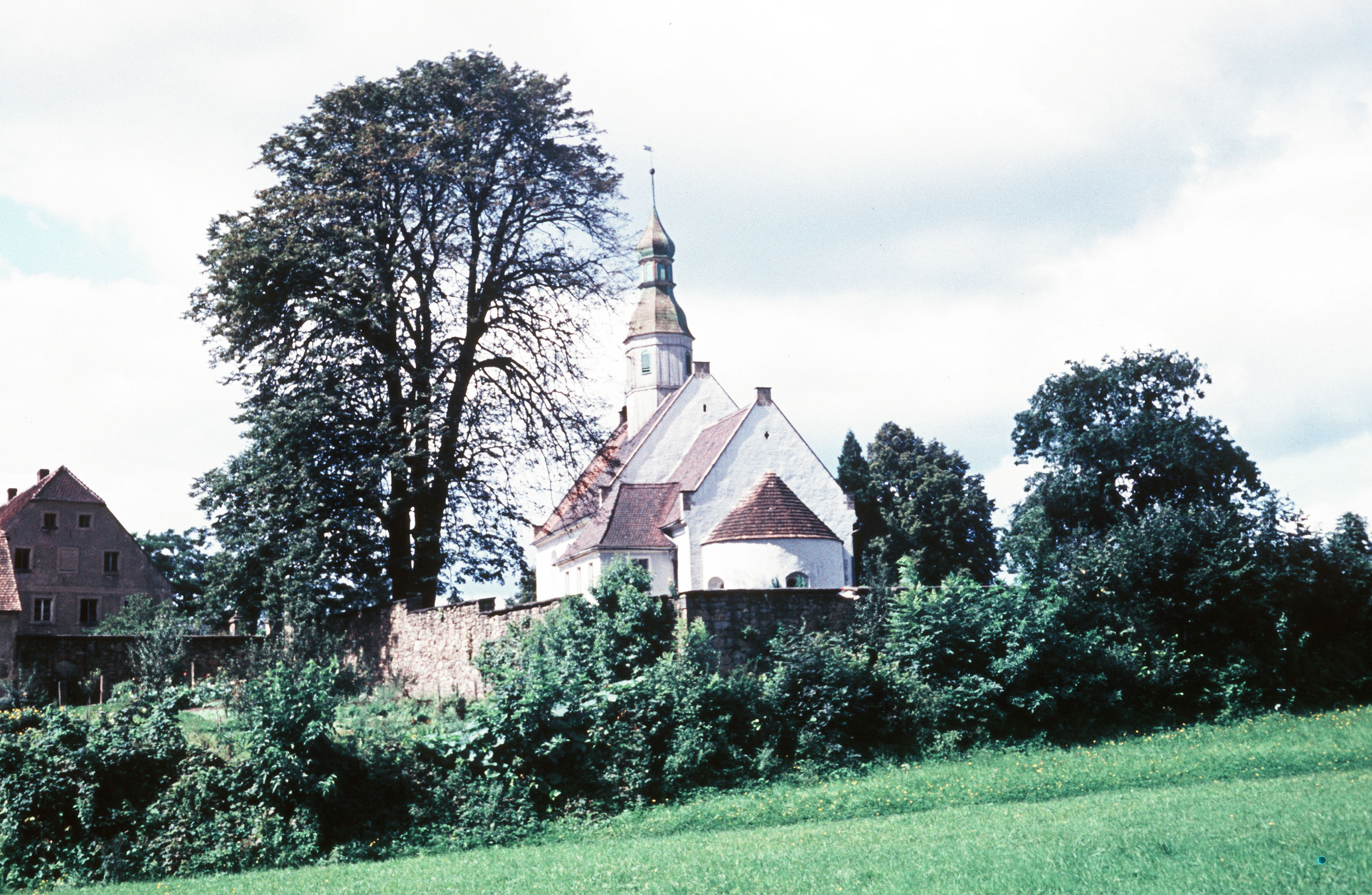 Blick über blühende Wiese auf die Kirche von Arnsdorf