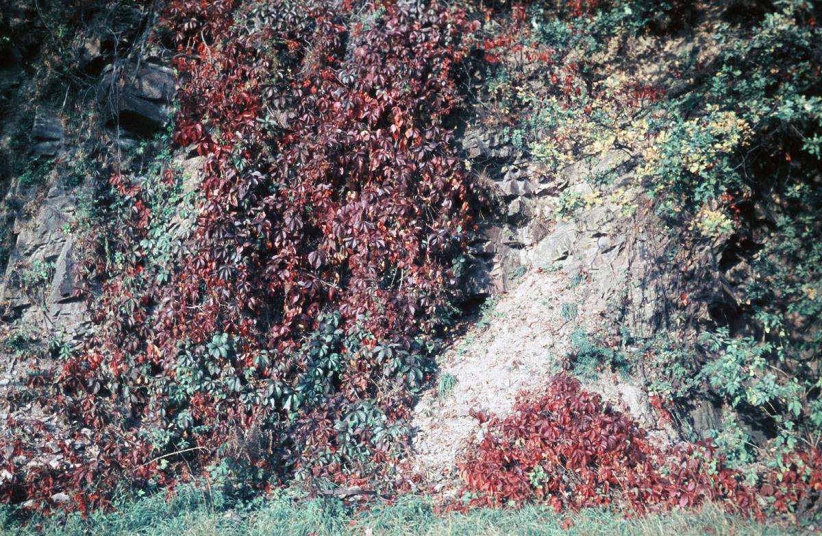 Mit wildem Wein bewachsene Felswand (Grauwacke)