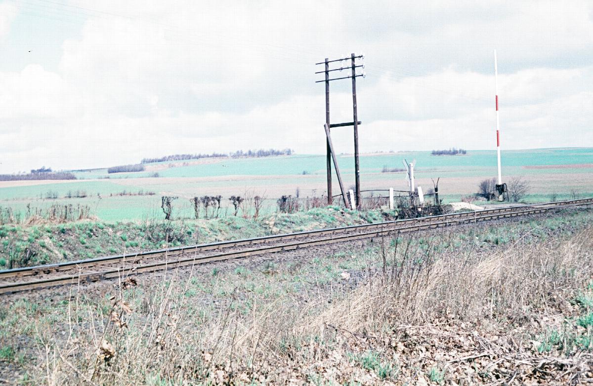 Blick zum Galgenberg über Gleise am Bahnübergang auf weite Ackerlandschaft