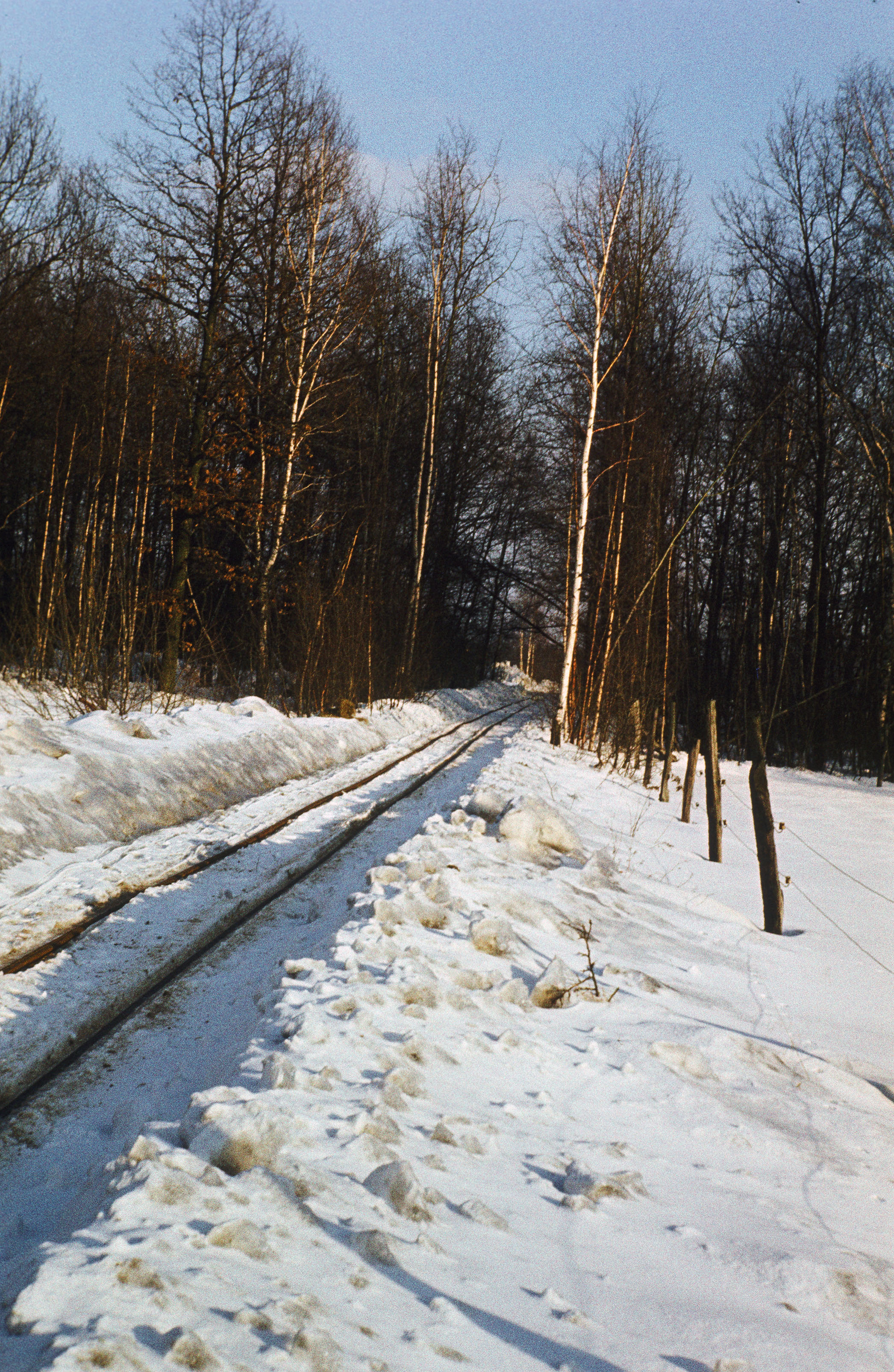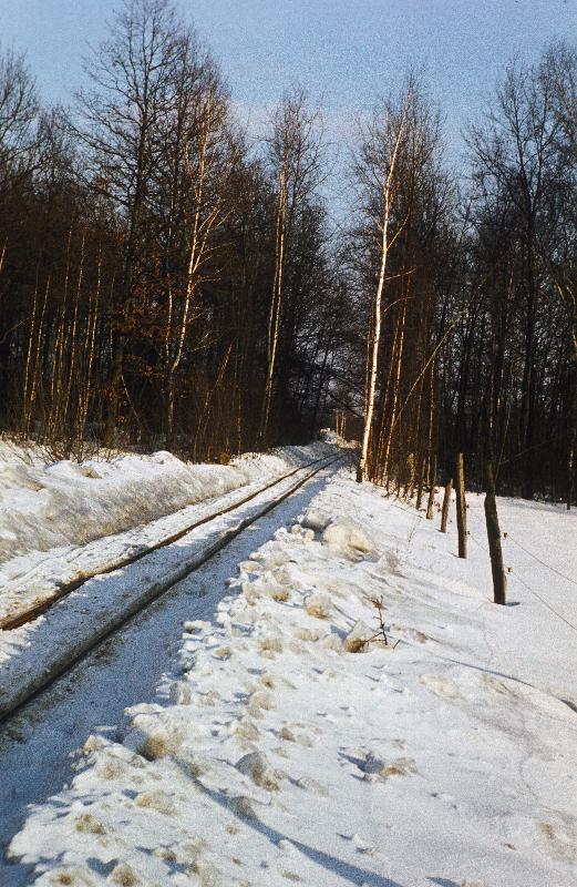 Winterlandschaft mit Blick entlang der Gleise der Kalkbahn bei Charlottenhof