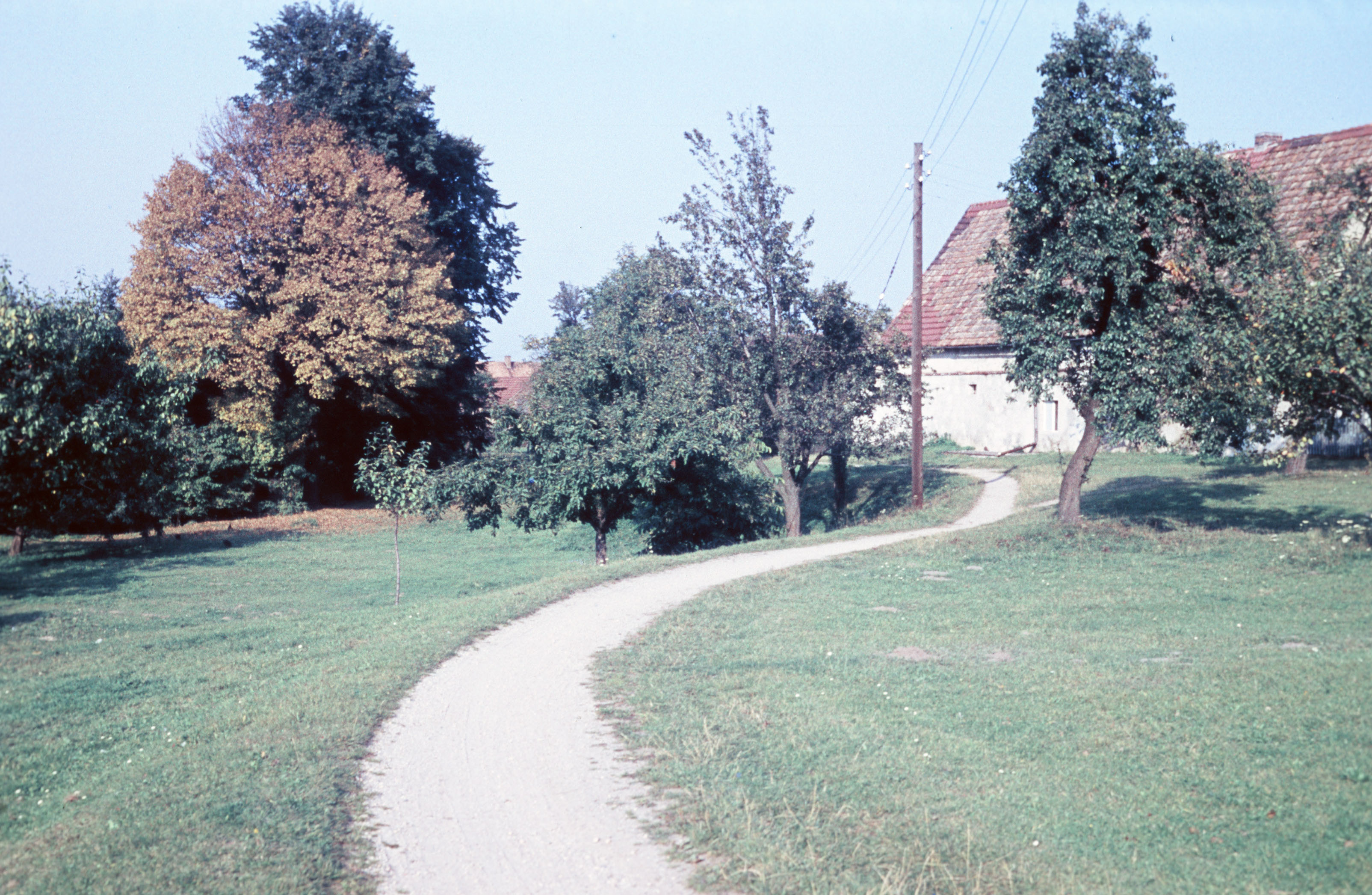 Von Wiesen umgebener schmaler Dorfweg durch Nieder Rengersdorf