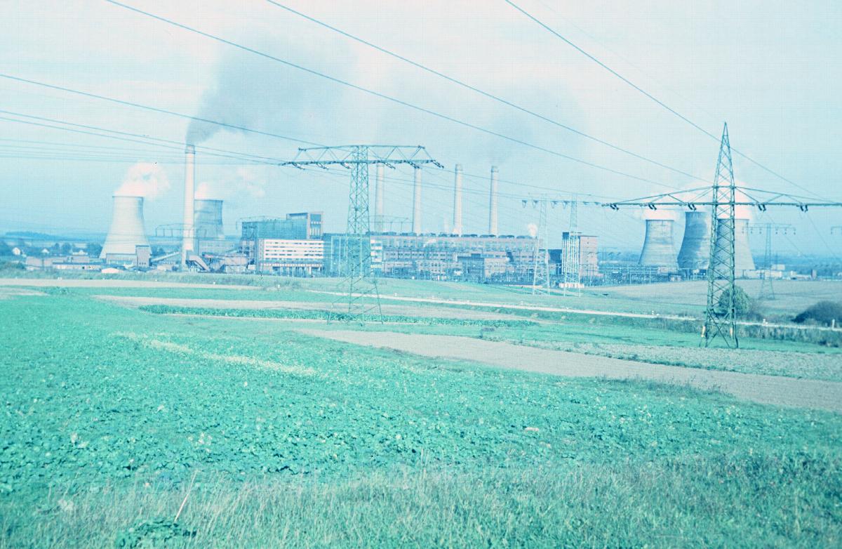 Blick über Ackerland auf das Kraftwerk "Völkerfreundschaft" bei Hagenwerder