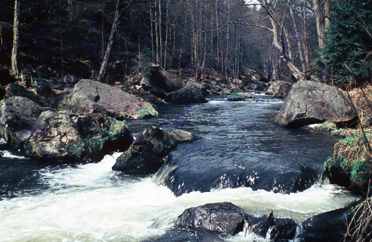 Fluss Wesewitz mit Felsen durch Wald unterhalb von Dittersbach