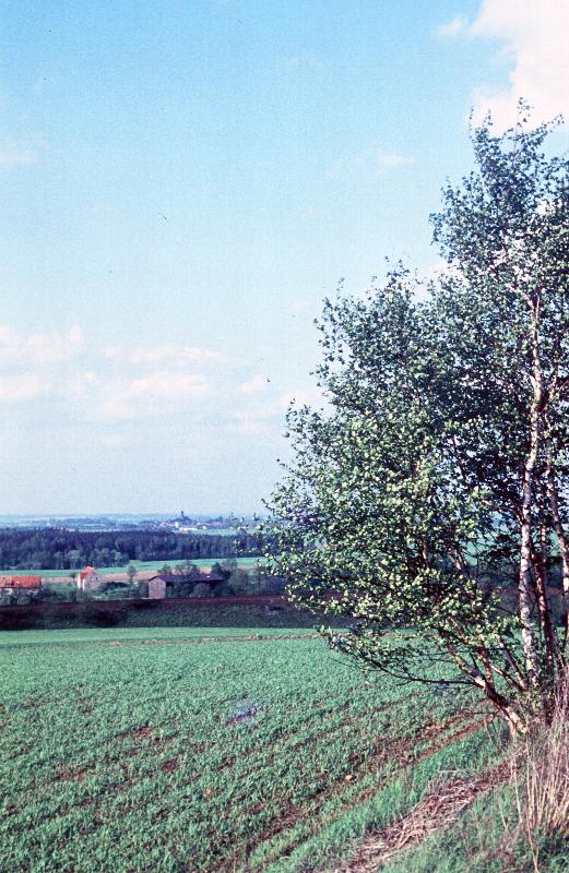 Blick über Ackerland, Gleise und Ortschaften bei Uhyst