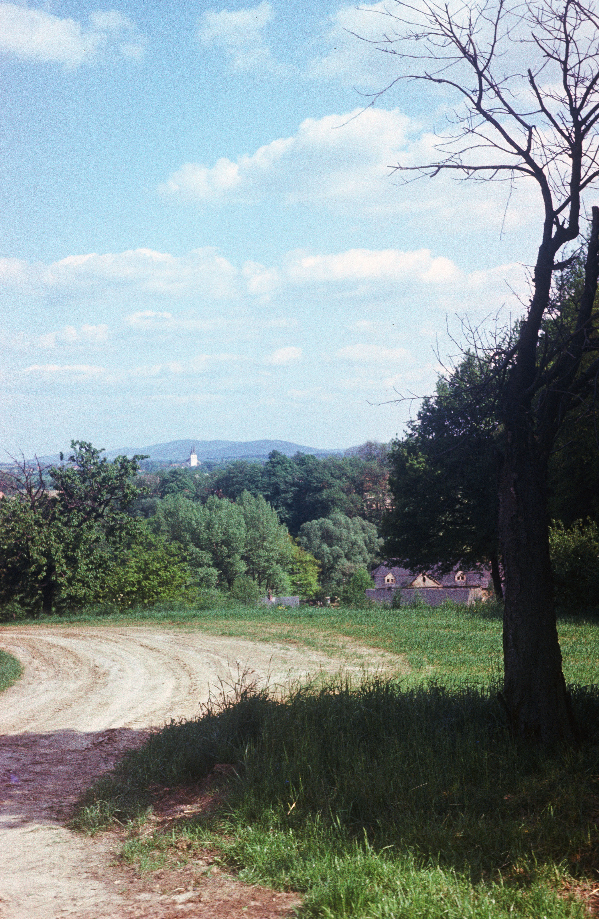 Blick entlang eines Weges über ein Tal auf Göda, im Hintergrund Berge