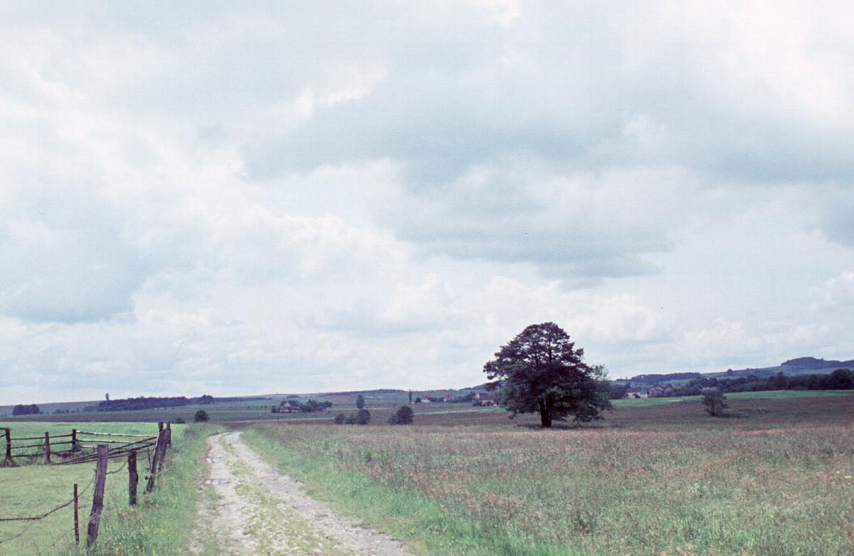Feldweg durch Grünland mit vereinzelten Baumgruppen