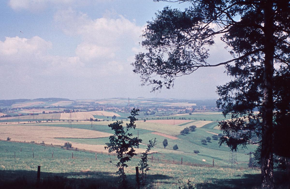 hügelige Grün- und Ackerlandschaft mit Blick auf Pulsnitz