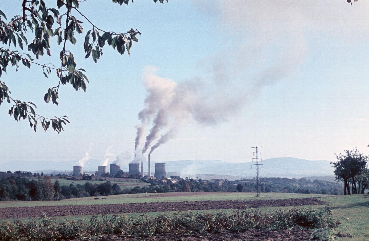 Blick über Ackerland zum Kraftwerk Hirschfelde