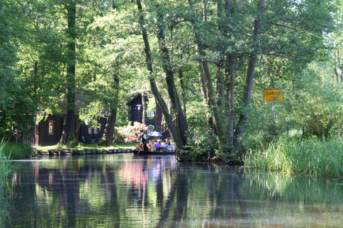 Bootsfahrt im Spreewald am Ortseingang Lehde (Ortsschild)