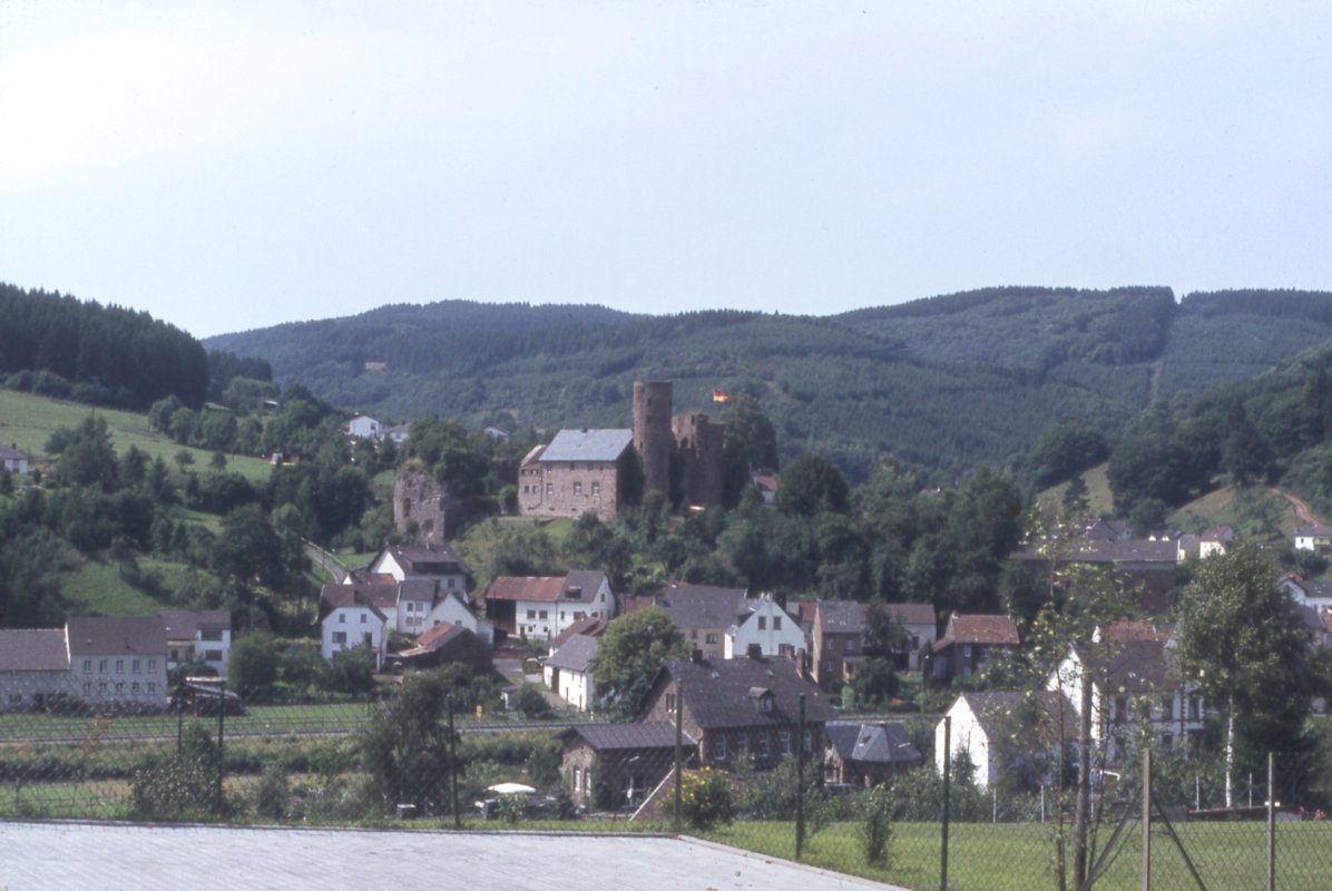 Standort: Mürlenbach, Meisburger Straße, Blick in Richtung Nordost auf Mürlenbach, die Bertradaburg und die überwiegend bewaldeten Hügel.