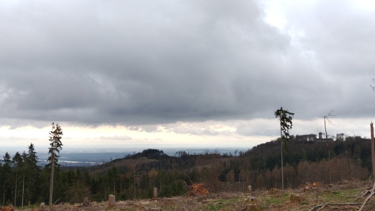 Blick vom Hans-Rothe-Weg Richtung Rhein und Rheinhessen. Im Vordergrund Waldschadensflächen, rechts Hallgarter Zange.