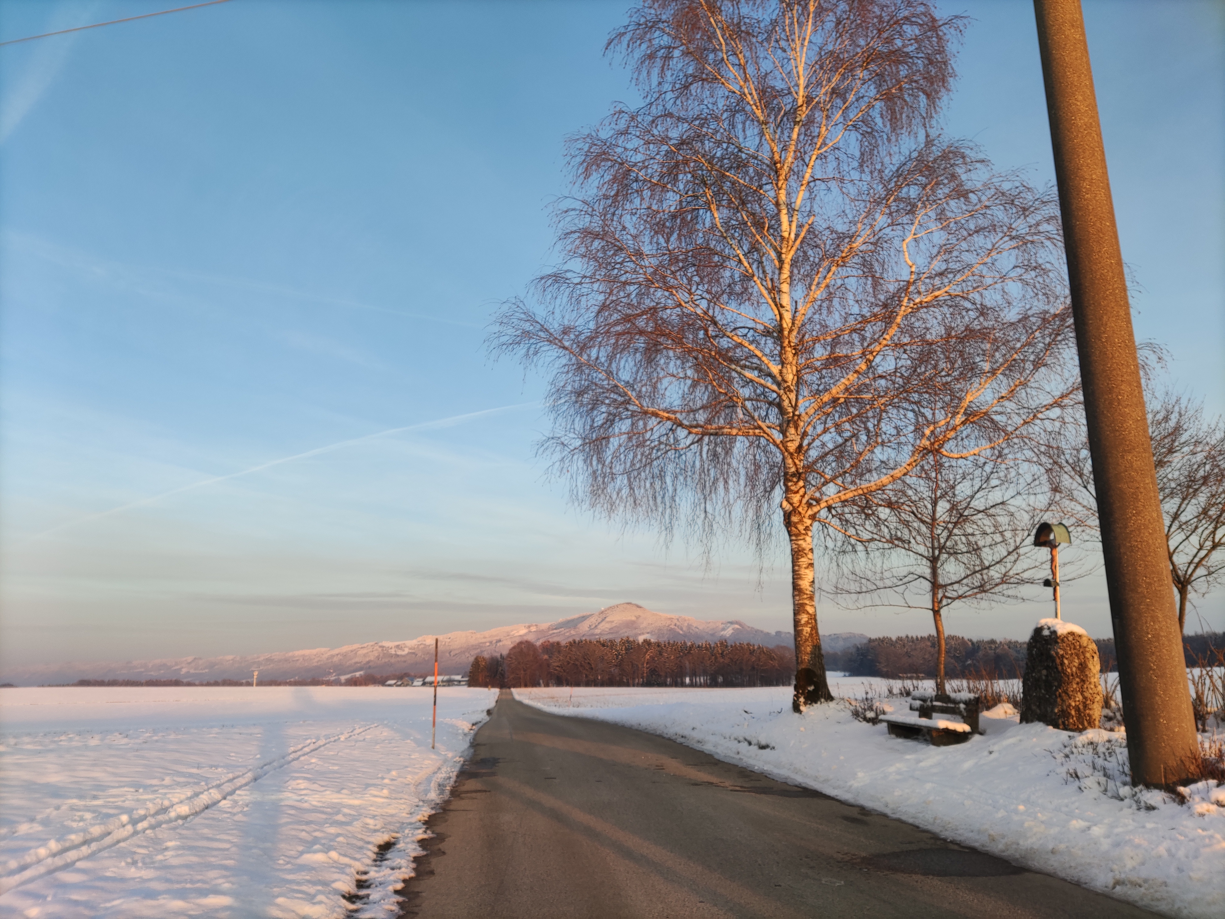 Verschneite Landschaft mit Blick auf den österreichischen Haunsberg von dem östlichen Ende von Abtsdorf mit der Straße Richtung Thannhausen und Gastag.
