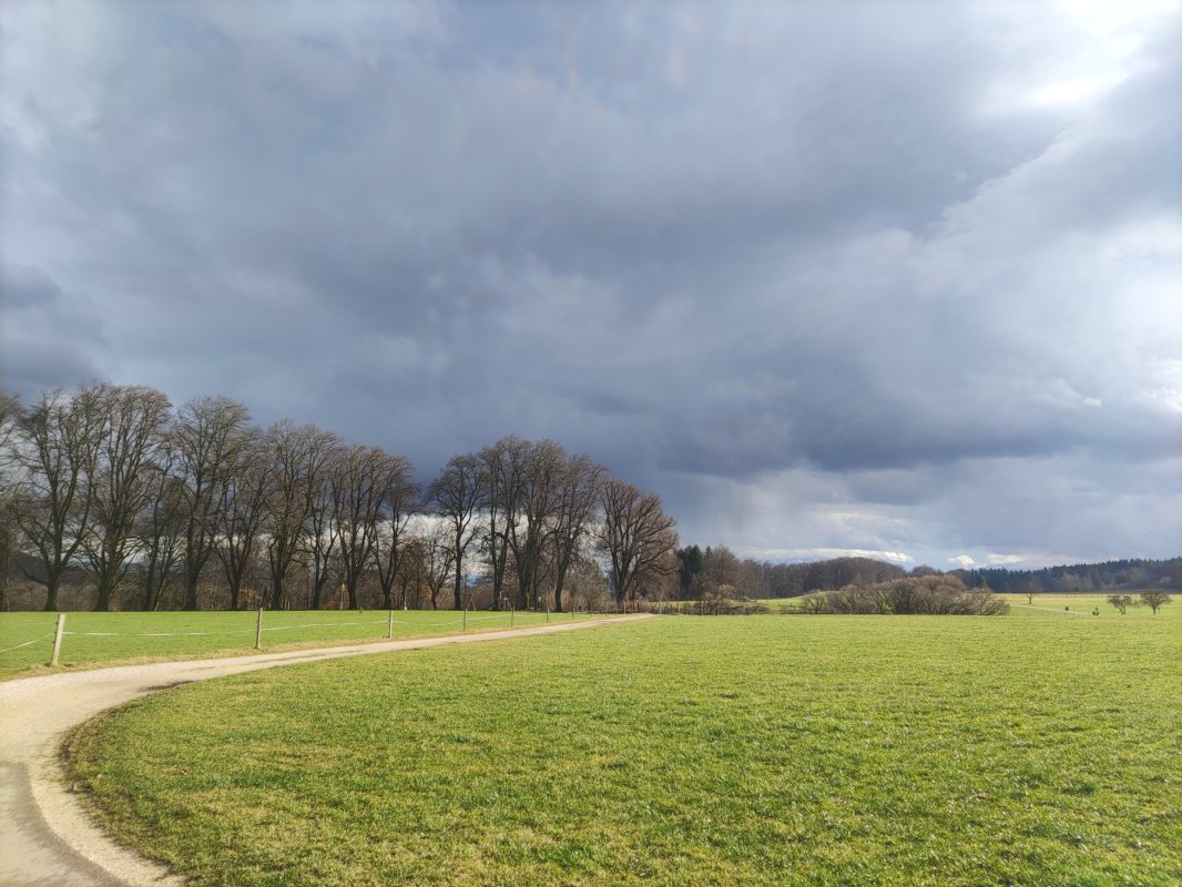 Blick vom "Sappl-Bauern" in Laufen auf die Weide, den Kiesweg und die Wiese. Bei der Reihe von Bäumen im Hintergrund handelt es sich um die "Salzburger Allee", ein Kiesweg vom Spielplatz zur Wohngegend an der Weide entlang.